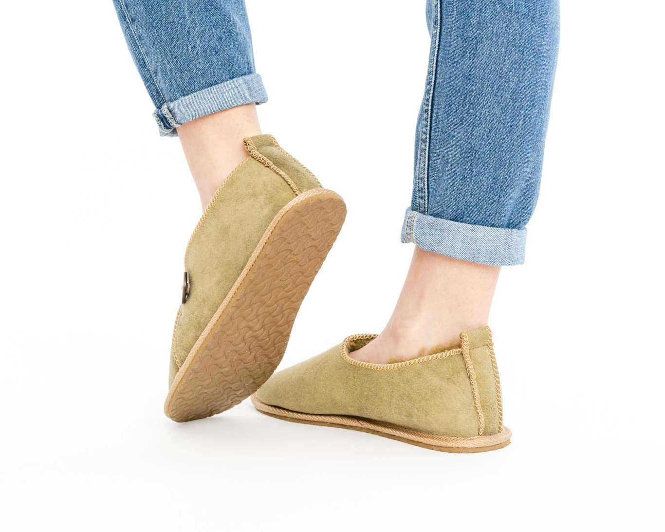 These olive house slippers with rubber sole combine cozy lining with a stable sole for safe, everyday use at home.