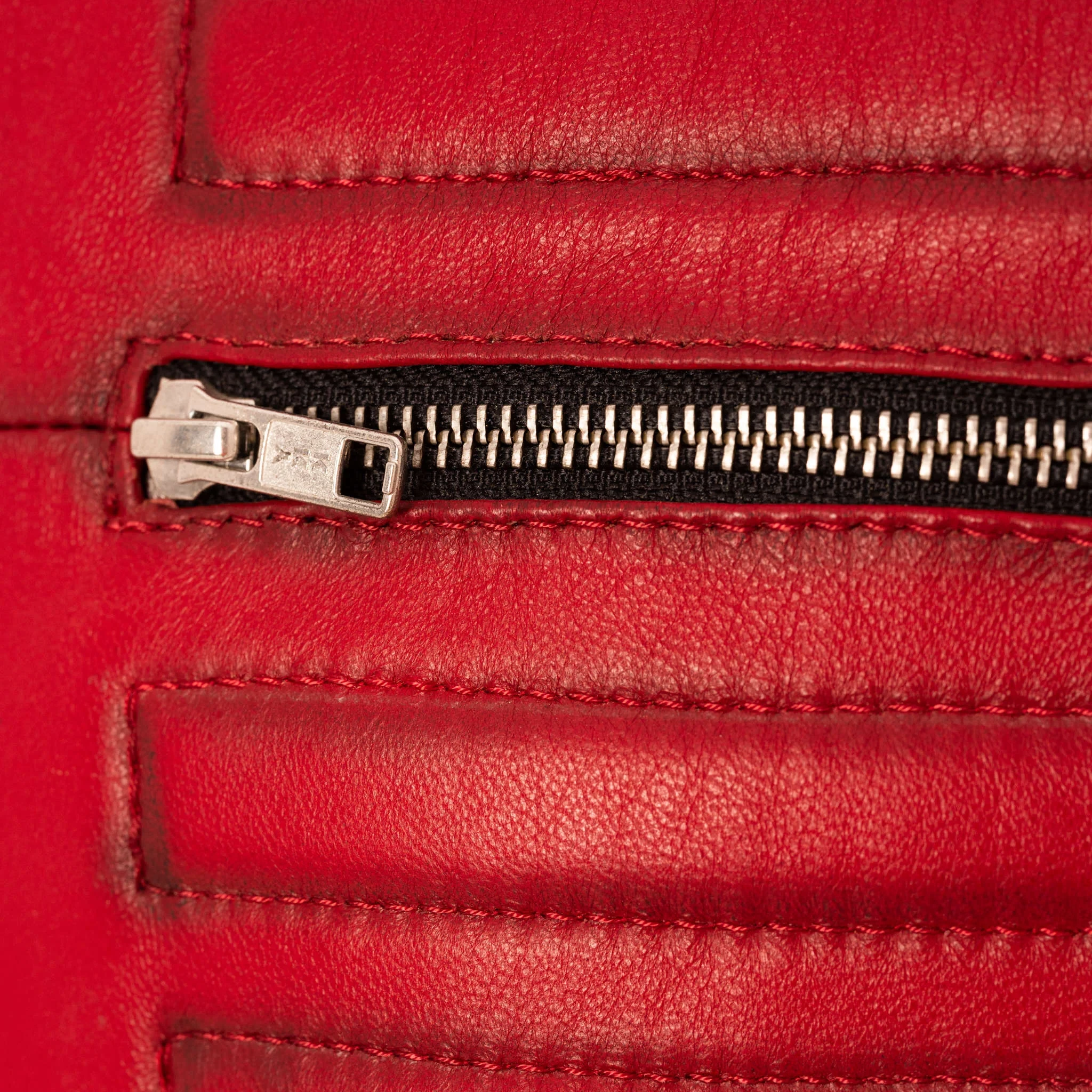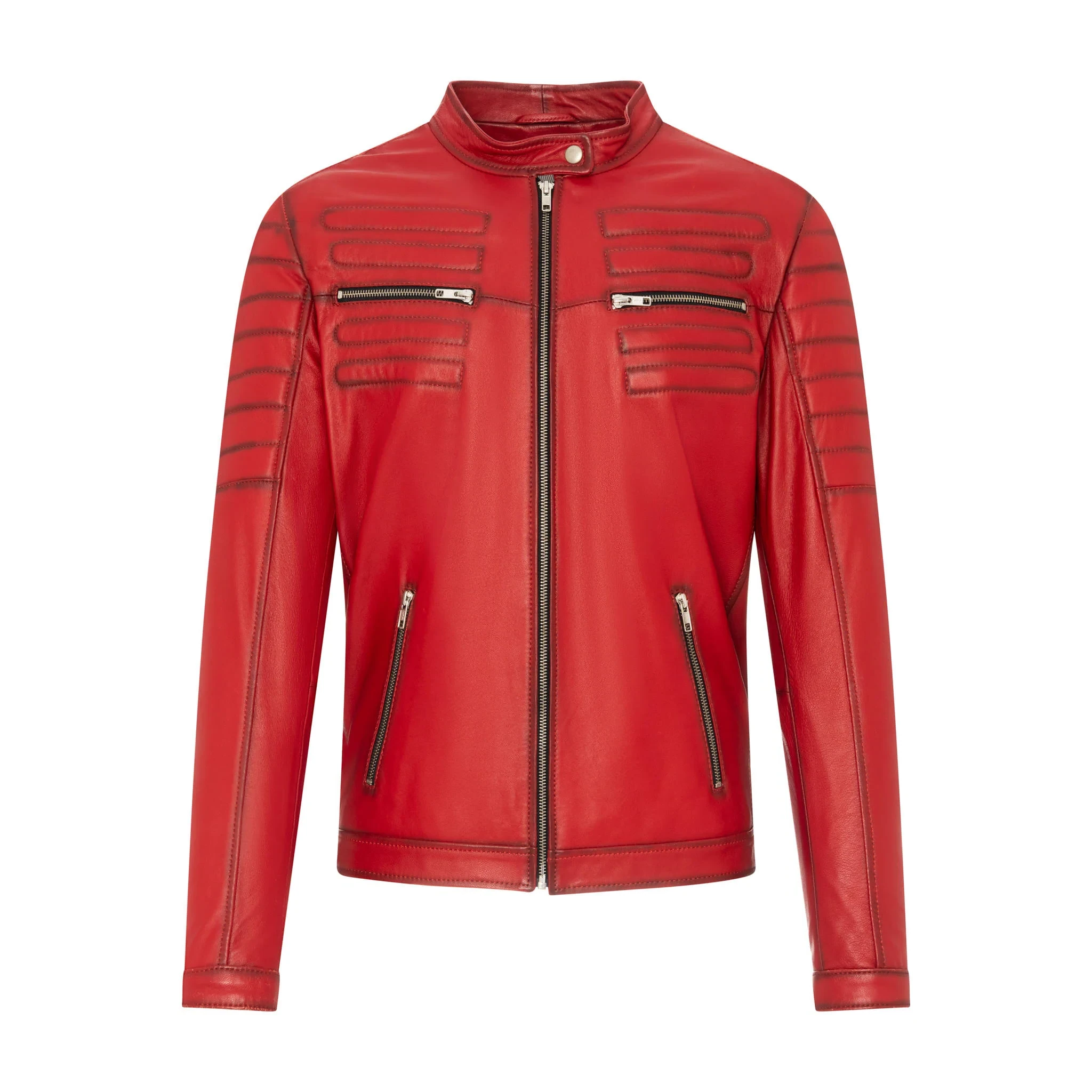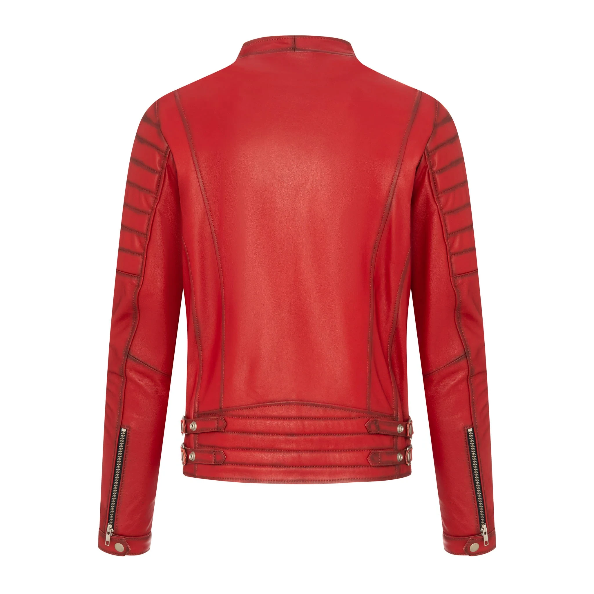 This red men’s leather jacket stands out with its vibrant shade and natural leather finish.