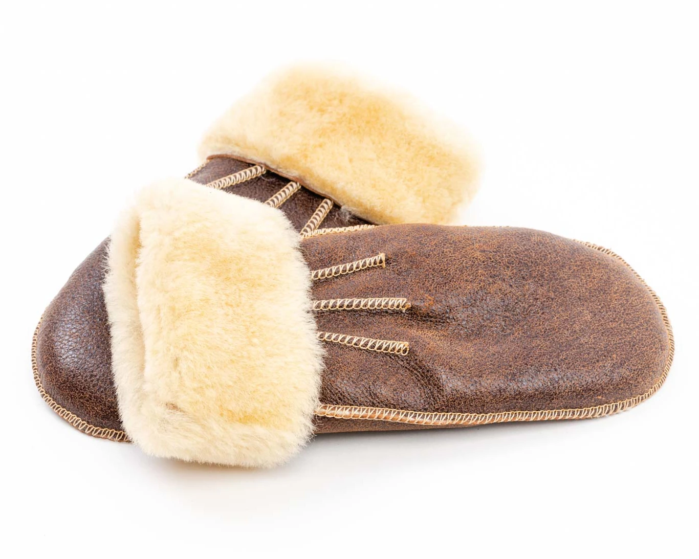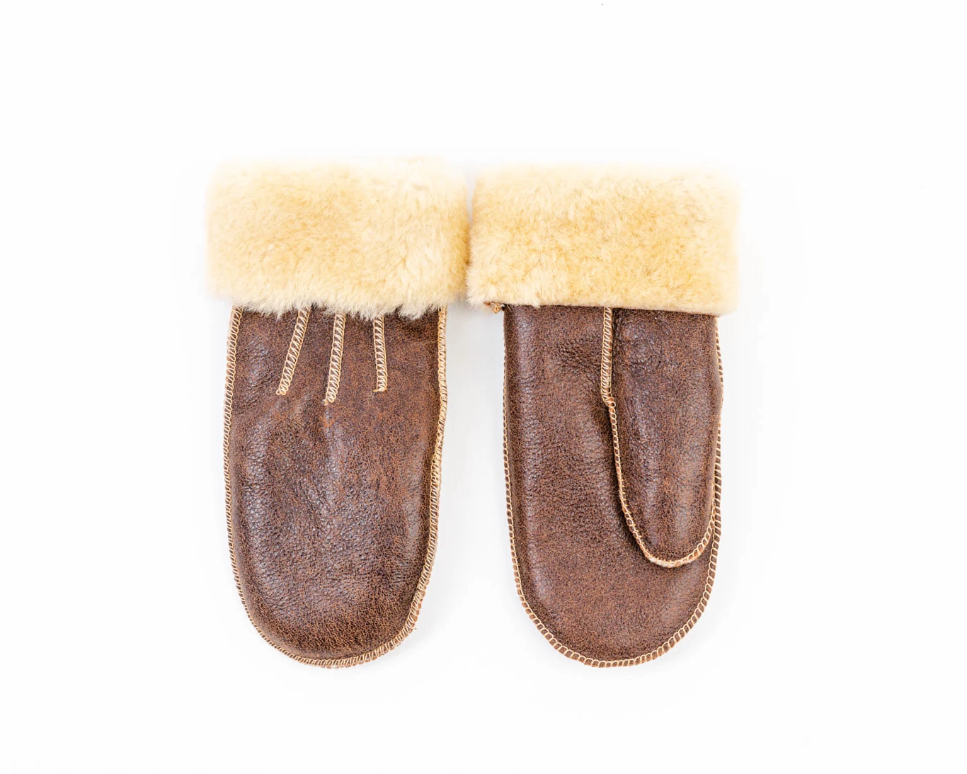 The brown sheepskin mittens combine rustic charm with dependable insulation. Thick wool lining keeps hands warm and dry, while the durable sheepskin outer ensures long-lasting wear.
