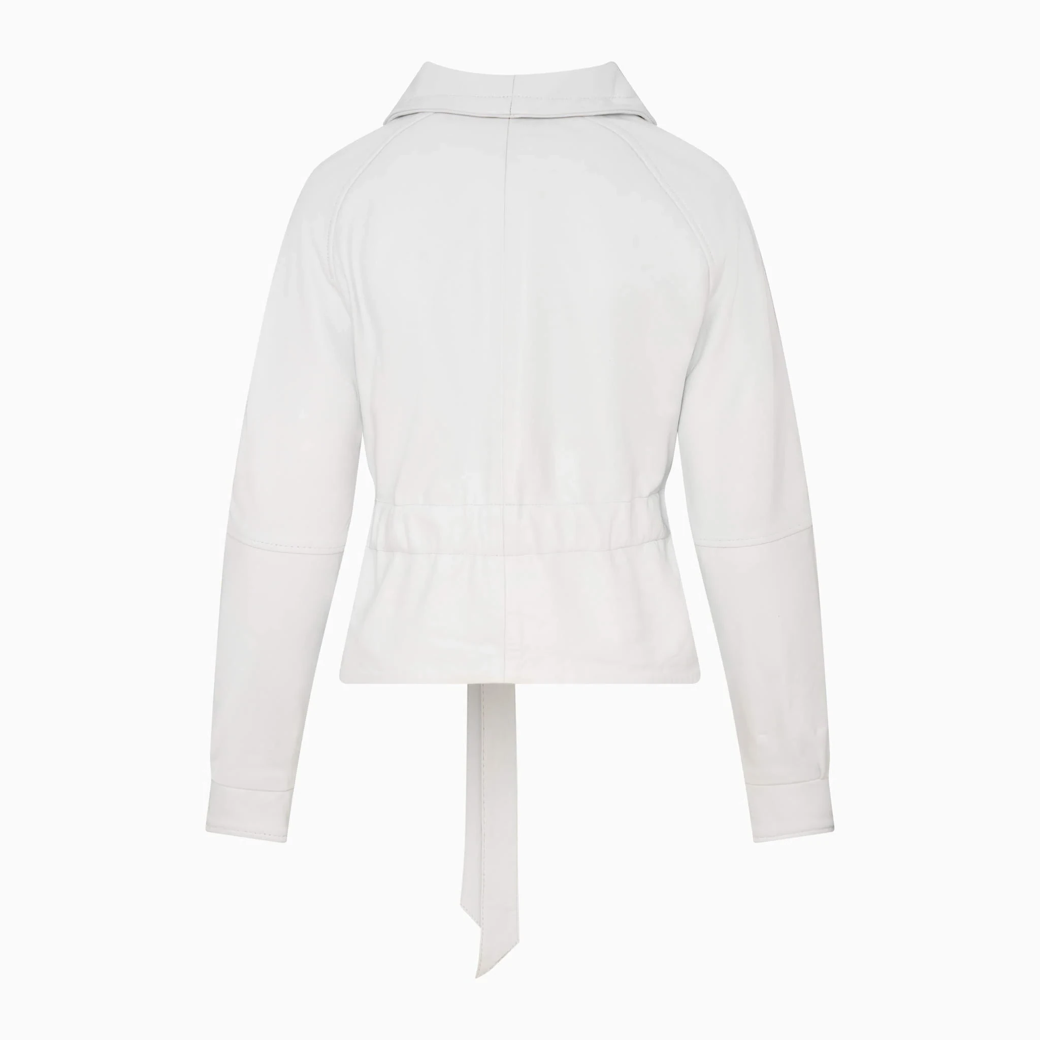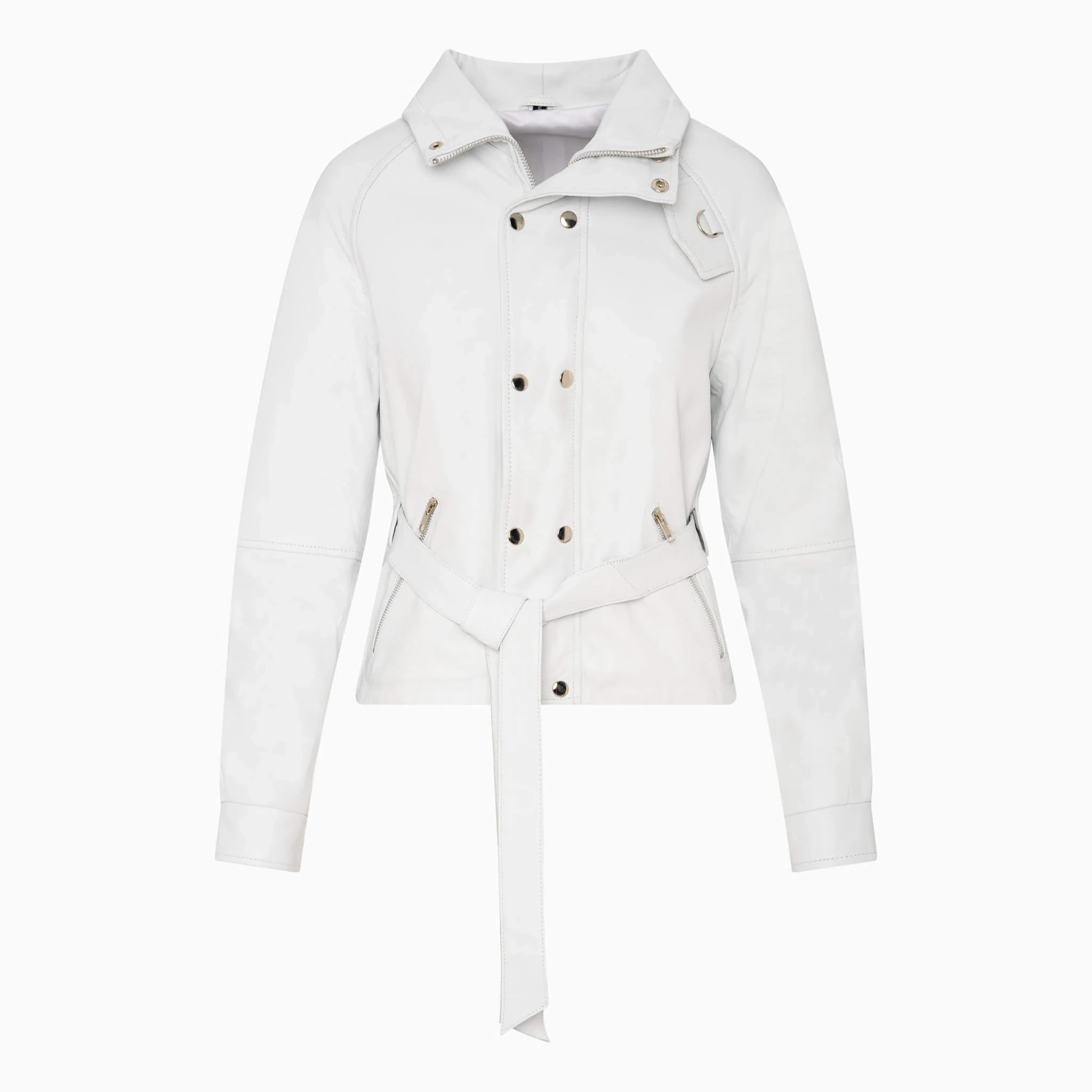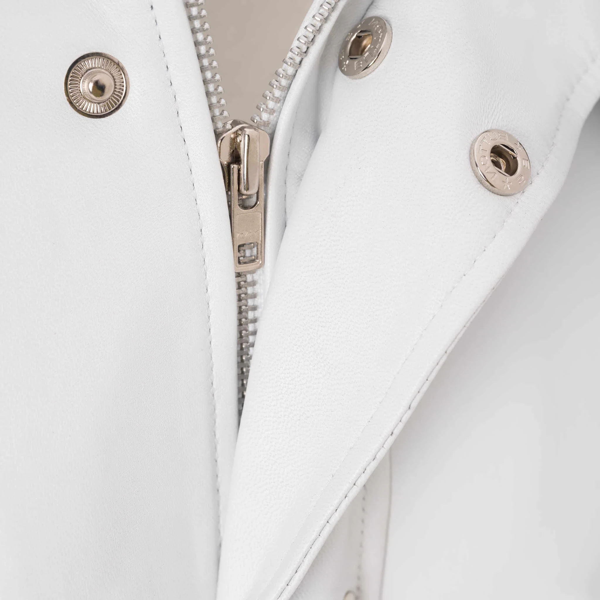 The EMMA model is a unique women’s jacket in a snow-white color, made from delicate natural lambskin leather. Perfect for spring and autumn days, this jacket adds character to any outfit. The leather belt beautifully highlights the feminine silhouette, while the white color ensures you’ll stand out and express your unique style.